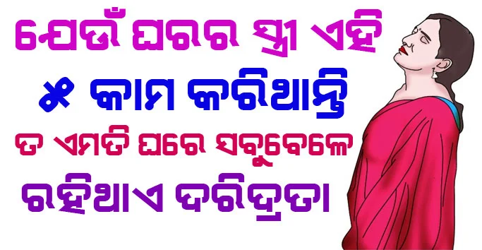 ବନ୍ଧୁଗଣ ନମସ୍କାର, ବନ୍ଧୁଗଣ ଆଜି ଆମେ ଆପଣଙ୍କୁ ଏଭଳି ୫ଟି କାର୍ଯ୍ୟ ସମ୍ବନ୍ଧରେ କହିବୁ ଯେଉଁ କାର୍ଯ୍ୟ କୁ ଘରର ସ୍ତ୍ରୀ ବିଳମ୍ବ ପର୍ଯ୍ୟନ୍ତ କରିବା ଦ୍ୱାରା ଘରେ ଦାରିଦ୍ର୍ୟତା ଆସିଥାଏ ।