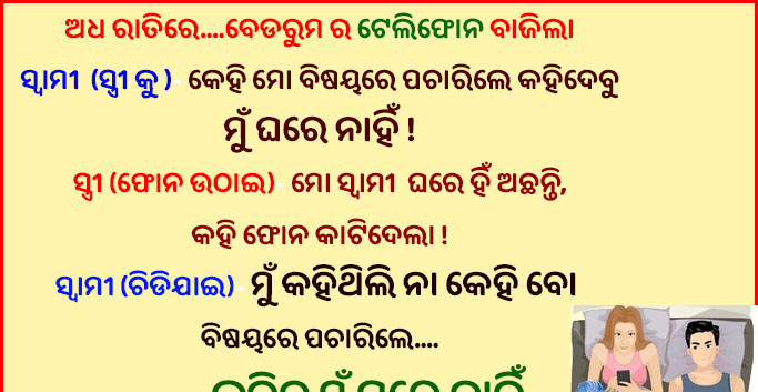 Odia Jokes- ଅଧ ରାତିରେ ବେଡରୁମର ଟେଲିଫୋନ ବାଜିଲା, ସ୍ଵାମୀ (ସ୍ତ୍ରୀ କୁ )- କେହି ମୋ ବିଷୟରେ ପଚାରିଲେ କହିଦେବୁ ମୁଁ ଘରେ ନାହିଁ ! ସ୍ତ୍ରୀ (ଫୋନ ଉଠାଇ)- ମୋ ସ୍ଵାମୀ ଘରେ ହିଁ ଅଛନ୍ତି…