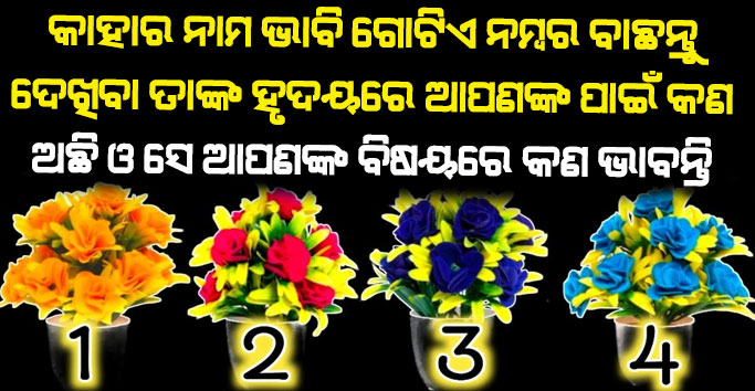 ବନ୍ଧୁଗଣ ଆଜି ଆପଣଙ୍କ ପାଇଁ ବହୁତ ଭଲ ବିଷୟବସ୍ତୁ ନେଇ ଆସିଛୁ । ଆପଣଙ୍କ ପାଇଁ ୪ଟି ରଙ୍ଗର ଫୁଲର ନେଇ ଆସିଛୁ । ଏଥି ମଧ୍ୟରୁ ଆପଣଙ୍କୁ ଯେ କୌଣସି ଗୋଟିଏ ଚୟନ କରିବାକୁ ହେବ । ଏହା ପରେ ଆମେ ଆପଣଙ୍କୁ କହିବୁ ତାଙ୍କ ମନରେ ଆପଣଙ୍କ ପାଇଁ କଣ ଚାଲିଛି । ଆପଣ ଚାହିଁଲେ ଦୁଇ ଜଣ ବ୍ୟକ୍ତିଙ୍କ ପାଇଁ ଅଲଗା ଅଲଗା ଫୁଲ ଚୁଜ କରିପାରିବେ । ତେବେ କାହାର ନାଁ ଭାବି ଆପଣ ବାଛନ୍ତୁ ଯେ କୌଣସି ଗୋଟିଏ ନମ୍ବର ଆଉ ଜାଣନ୍ତୁ ତାଙ୍କ ମନରେ ଆପଣଙ୍କ ପାଇଁ କଣ ଚାଲିଛି ।