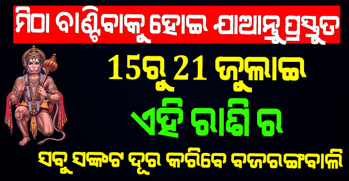 ବନ୍ଧୁଗଣ ଆସନ୍ତା କାଲି ସକାଳୁ ଅଚାନକ ଚମକି ଉଠିବ ଏହି ରାଶିର ଭାଗ୍ୟ । ଭଗବାନ ହନୁମାନଙ୍କ କୃପାରୁ 12ଟି ରାଶିଙ୍କ ମଧ୍ୟରୁ କିଛି ରାଶିଙ୍କ ଉପରେ ଅଧିକ ପ୍ରସନ୍ନ ହେବାକୁ ଯାଉଛି । ଏହି ରାଶିଙ୍କ ଜୀବନରୁ ସବୁ ଦୁଃଖ କଷ୍ଟ ଦୂର ହେବାକୁ ଯାଉଛି । ଏହି ରାଶି ଙ୍କ ଜୀବନରେ ଆସିବାକୁ ଯାଉଛି ଅପାର ଖୁସି ହିଁ ଖୁସି । ଜୁଲାଇ 15ରୁ 21 ଯାଏଁ ଏହି ରାଶିଙ୍କ ଭାଗ୍ୟରେ ଆସିବାକୁ ଯାଉଛି ଅନେକ ସାରା ଖୁସି । ତେବେ ଆସନ୍ତୁ ଜାଣିବା ସଂପୂର୍ଣ୍ଣ ବିବରଣୀ ।