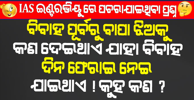 IAS ଇଣ୍ଟରଭିୟୁ ରେ ପଚରାଯାଇଥିବା ପ୍ରଶ୍ନ- ବିବାହ ପୂର୍ବରୁ ବାପା ଝିଅକୁ କଣ ଦେଇଥାଏ ଯାହା ବିବାହ ଦିନ ଫେରାଇ ନେଇଥାଏ ? କୁହ କଣ ?