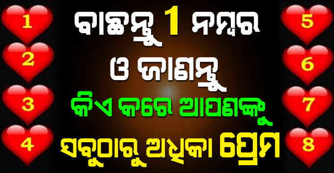 ବନ୍ଧୁଗଣ ଆଜି ଆମେ ଆପଣଙ୍କ ପାଇଁ ଏକ ମଜାଦାର କୁଇଜ ଗେମ ନେଇ ଆସିଛୁ । ଏହି ଗେମ ଅନୁସାରେ ଆପଣଙ୍କ ଆମେ ଦେଇଥିବା କିଛି ନମ୍ବର ମଧ୍ୟରୁ ଯେ କୌଣସି ଗୋଟିଏ ନମ୍ବର ଚୟନ କରିବାକୁ ପଡିବ । ଏଥିପାଇଁ ଆପଣଙ୍କୁ ମାତ୍ର ୫ ସେକେଣ୍ଡ ର ସମୟ ଦିଆଯିବ । ଏହା ପରେ ଦେଖିବା ଆପଣଙ୍କୁ ଆପଣଙ୍କ ଜୀବନରେ ସବୁଠାରୁ ଅଧିକ ଭଲ କିଏ ପାଉଛନ୍ତି । ତେବେ ଆସନ୍ତୁ ଆରମ୍ଭ କରିବା ଏହି ମଜାଦାର ଲଭ କୁଇଜ ଗେମ ।