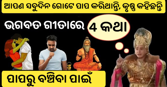 ଏହା ମନୁଷ୍ୟର ନୀତିଦିନିଆ ପାପ ହୋଇଥାଏ । ଭଗବାନ ଶ୍ରୀ କୃଷ୍ଣ ଆମର ଇଷ୍ଟ ଦେବ ଦେବ ଅଟନ୍ତି । ସେ ଭଗବତ ଗୀତା ରେ ମନୁଷ୍ୟକୁ ତାର ଜୀବନରେ ଠିକ ମାର୍ଗରେ ଯିବା ପାଇଁ ବହୁତ ଉପଦେଶ ଦେଇଛନ୍ତି । ଏହି ଭଳି ଭଗବାନ ଶ୍ରୀ କୃଷ୍ଣ ୪ ଟି ଉପଦେଶ ଦେଛନ୍ତି ଯାହାଦ୍ୱାରା କି ଆପଣ ପାପରୁ ରକ୍ଷା ପାଇପାରିବେ ।